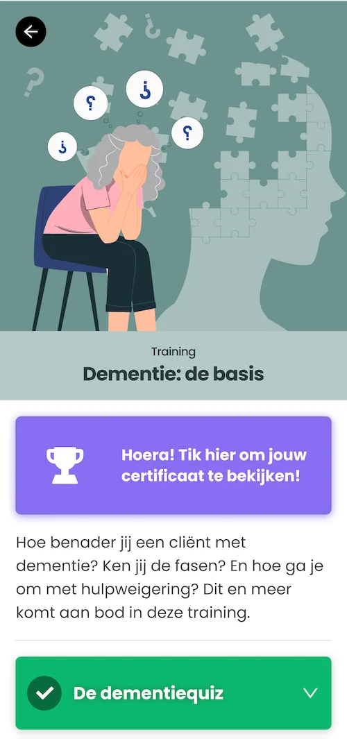 Na het voltooien van de training Dementie - de basis , zullen zorgmedewerkers beter uitgerust zijn om effectief te communiceren met dementiepatiënten. Ze zullen begrijpen hoe dementie de communicatie beïnvloedt en hoe ze hun communicatiestijl kunnen aanpassen om beter aan te sluiten bij de behoeften van de patiënt. Dit zal leiden tot betere zorgresultaten, meer tevredenheid bij de patiënt en een verbeterde werkervaring voor de zorgmedewerker.