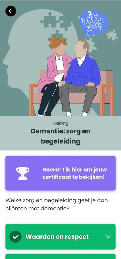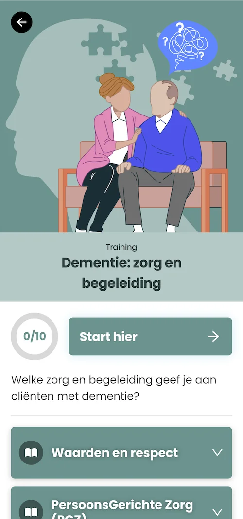 De training bestaat uit verschillende modules die nauw aansluiten op de beroepspraktijk van Verzorgenden en Verpleegkundigen. Elke module bevat ook quizzen om de opgedane kennis te toetsen en te versterken.