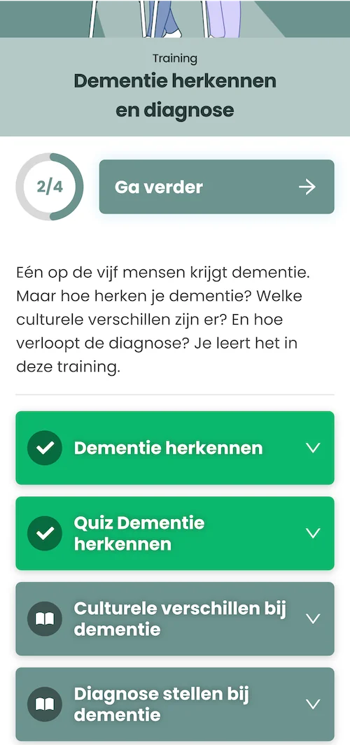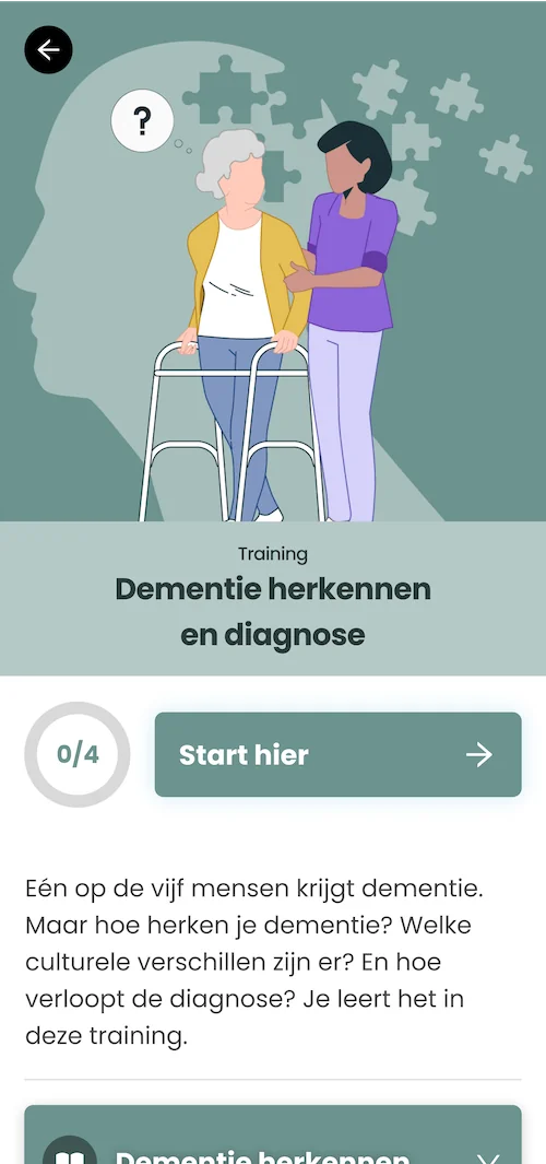 De training Dementie - herkennen en diagnose is ontwikkeld voor zorgmedewerkers. Na het volgen van deze training zijn zij in staat om de signalen van dementie te herkennen en te beschrijven. Daarnaast leren zij hoe zij deze informatie kunnen gebruiken om bij te dragen aan het stellen van een diagnose. De training biedt informatie over: