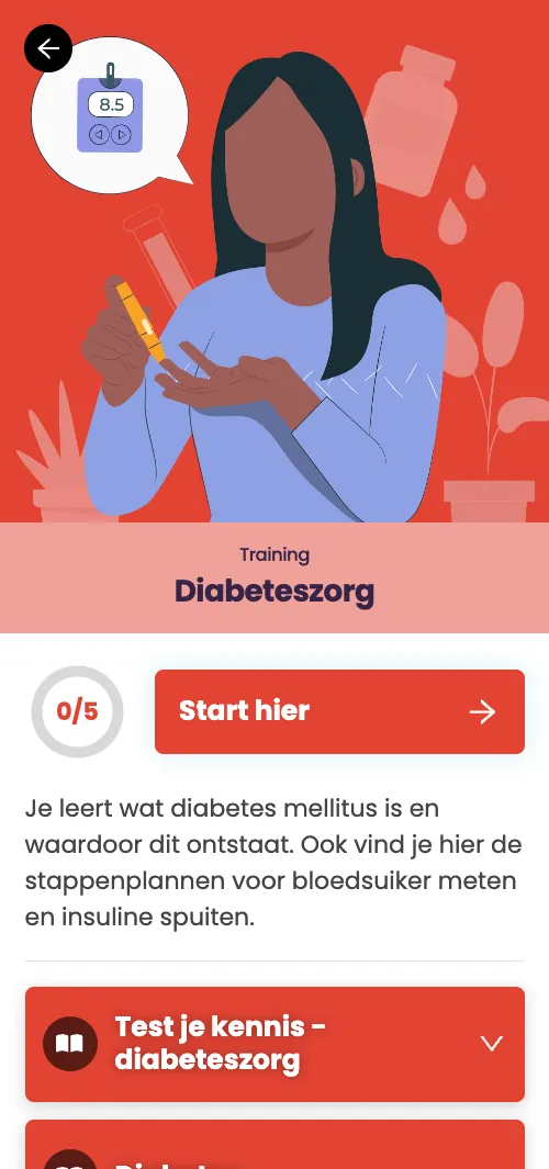 De training bestaat uit verschillende modules die aansluiten op de beroepspraktijk van Verzorgenden en Verpleegkundigen. Elke module bevat ook quizzen om de opgedane kennis te toetsen. De modules zijn ontworpen om de deelnemers te helpen hun bekwaamheid in de zorg voor diabetespatiënten te verbeteren.