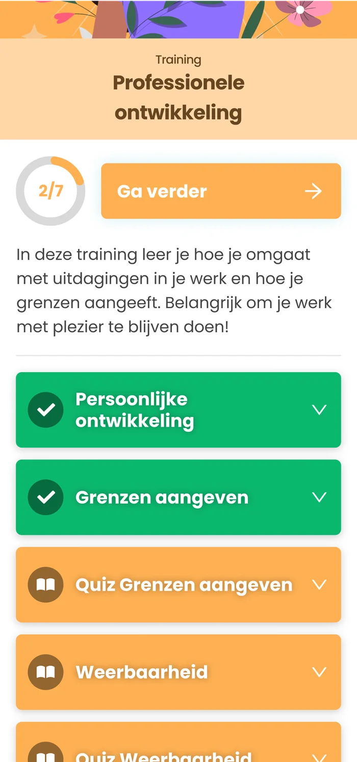 De training bestaat uit vier modules die aansluiten op de beroepspraktijk van zorgmedewerkers. Elke module bevat ook quizzen om de opgedane kennis te toetsen en te versterken.