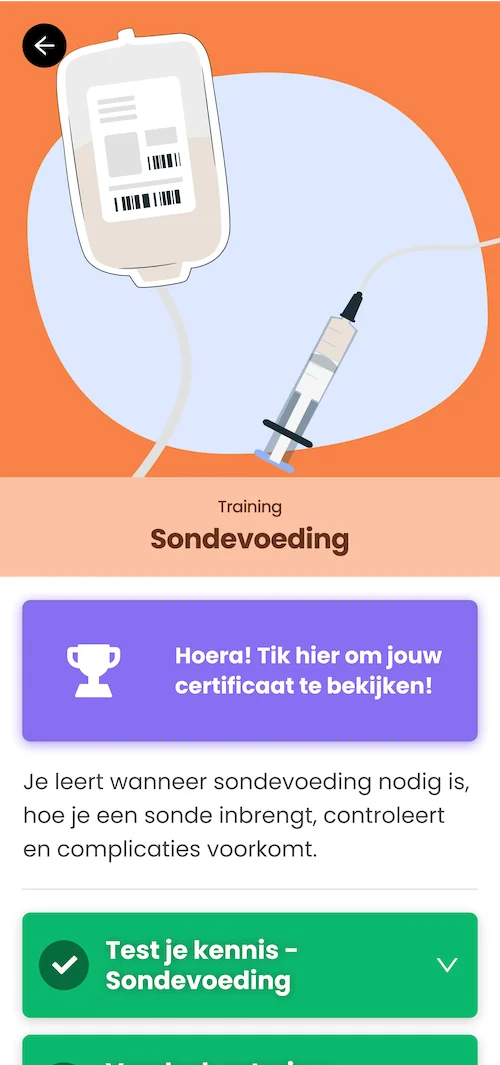 Na het voltooien van de training Sondevoeding toedienen en plaatsen zijn Verzorgenden en Verpleegkundigen in staat om sondevoeding op een veilige en effectieve manier toe te dienen en te plaatsen. Ze hebben een diep begrip van de complicaties die kunnen optreden en hoe deze te voorkomen. Daarnaast hebben ze de kennis om protocollen te volgen en kunnen ze hun kennis en vaardigheden in de praktijk toepassen. Dit draagt bij aan een betere zorg voor cliënten die afhankelijk zijn van sondevoeding.