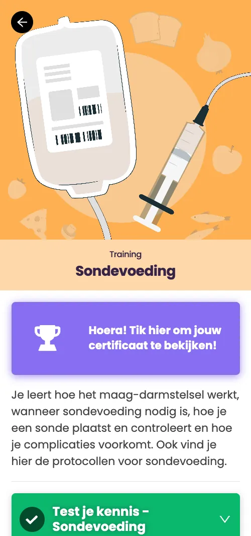 De training Sondevoeding bestaat uit 6 modules en 1 quiz. Medewerkers starten met een kennistoets om hun huidige niveau in te schatten. Daarna leren ze de anatomie van het maag-darmstelsel, het plaatsen en toedienen van sondevoeding en mogelijke complicaties. De protocollen en een praktijkmodule sluiten de training af.