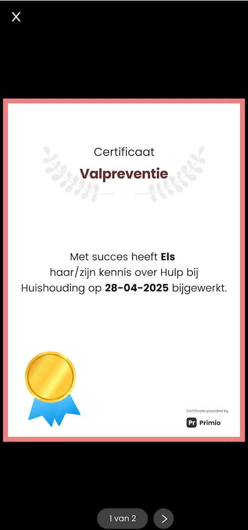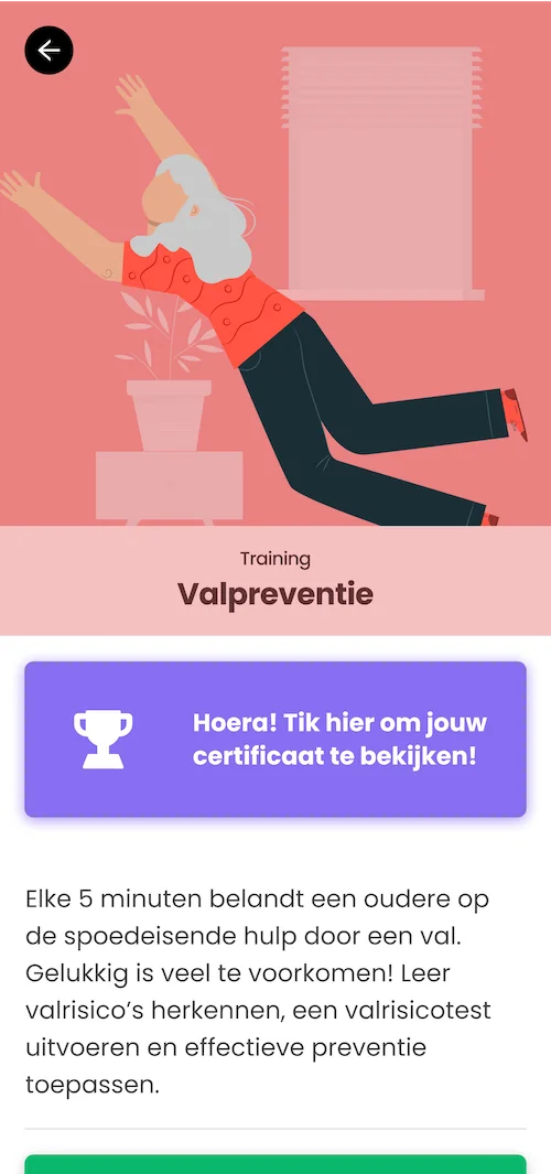 Na het volgen van de training Valpreventie zijn zorgmedewerkers in staat om een valrisicotest uit te voeren en de resultaten te interpreteren. Ze kunnen valrisico's bij ouderen identificeren en passende preventieve maatregelen nemen. Daarnaast zijn ze in staat om voorlichting te geven over valpreventie en kunnen ze cliënten doorverwijzen naar passende beweeginterventies. Dit draagt bij aan de veiligheid en het welzijn van de cliënten en kan het aantal vallen verminderen.