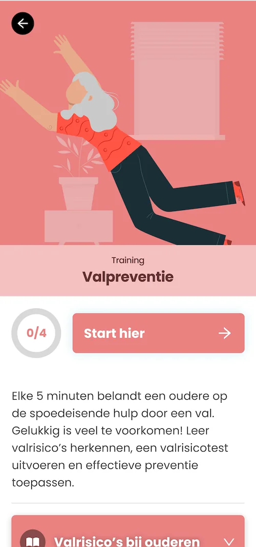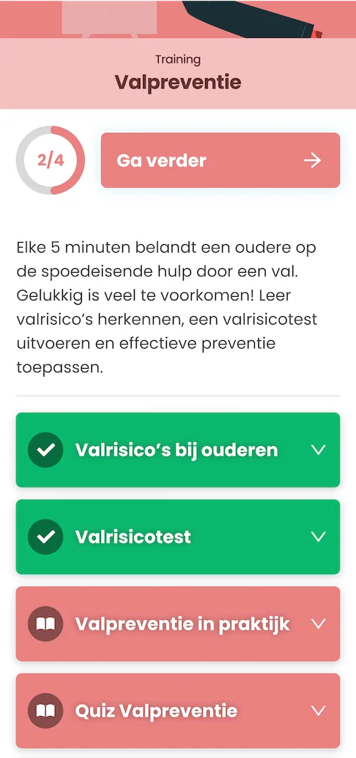 De training bestaat uit drie modules die aansluiten op de beroepspraktijk van zorgmedewerkers. Elke module bevat ook quizzen om de opgedane kennis te toetsen. De modules zijn ontworpen om zorgmedewerkers te voorzien van de nodige kennis en vaardigheden om valrisico's bij ouderen te identificeren en te verminderen.