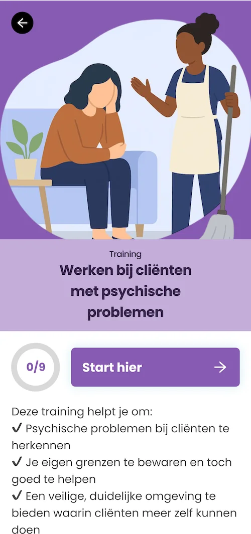 De training bestaat uit negen modules die aansluiten op de beroepspraktijk van medewerkers Huishoudelijke Hulp. Elke module bevat ook quizzen om de opgedane kennis te toetsen. De modules zijn praktijkgericht en behandelen verschillende aspecten van het werken met cliënten met psychische problemen.