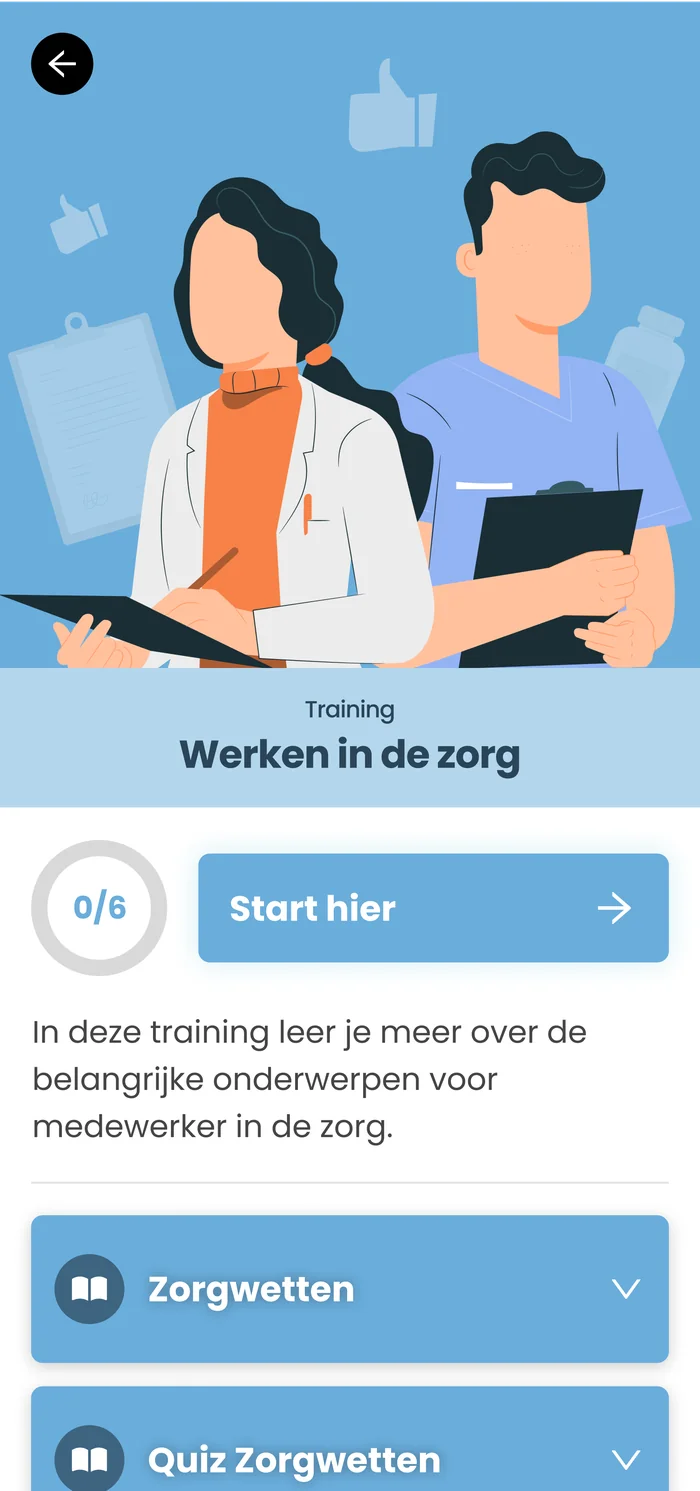 De training bestaat uit verschillende modules die aansluiten op de beroepspraktijk van zorgmedewerkers. Elke module bevat ook quizzen om de opgedane kennis te testen. De modules zijn ontworpen om zorgmedewerkers te helpen de complexiteit van de zorgwetten te begrijpen en hen te voorzien van praktische kennis en vaardigheden die ze in hun dagelijkse werk kunnen toepassen.