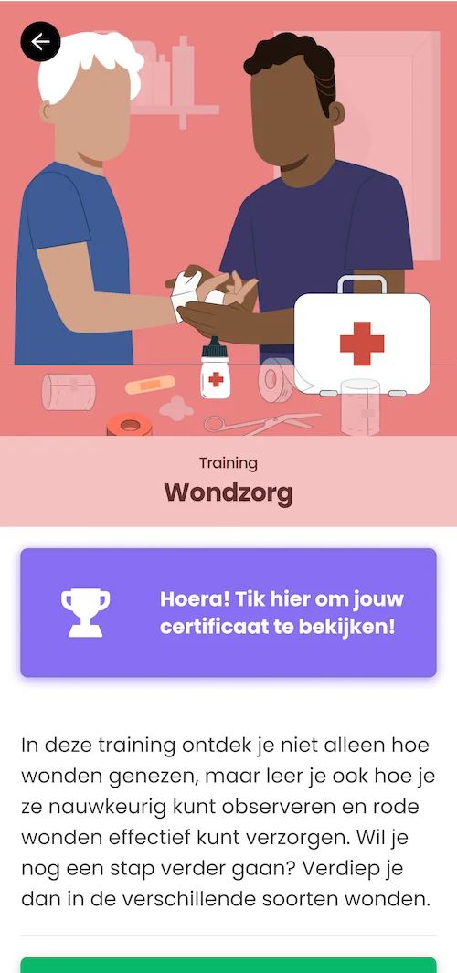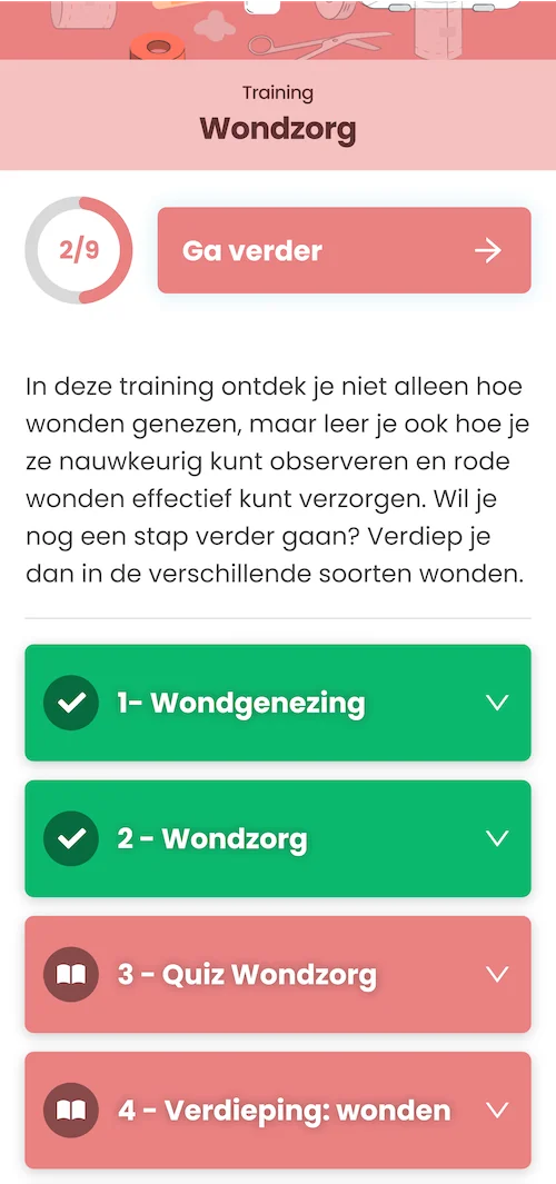 De training bestaat uit vier modules die aansluiten op de beroepspraktijk van Helpenden. Elke module bevat ook quizzen om de opgedane kennis te toetsen. De modules zijn opgebouwd rondom de thema's: soorten wonden, wondgenezing, wondzorg en risicovolle handelingen.
