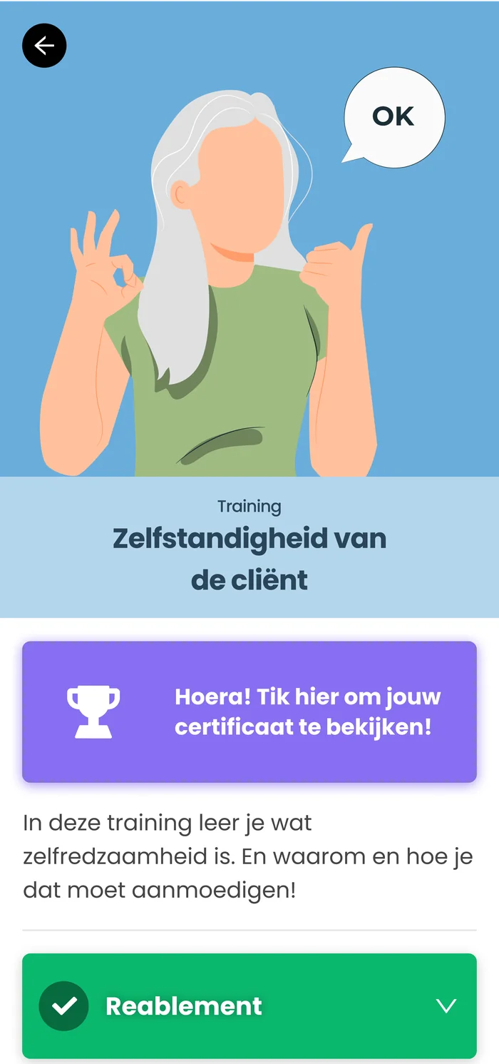 Na het volgen van de training hebben de medewerkers Huishoudelijke Hulp en Leefondersteuners de vaardigheden om de zelfstandigheid van hun cliënten te bevorderen. Ze leren hoe ze reablement kunnen toepassen, hoe ze de zelfstandigheid van hun cliënten kunnen ondersteunen en hoe ze vraaggericht kunnen werken. Deze vaardigheden stellen hen in staat om de zorg te verbeteren en de tevredenheid van hun cliënten te verhogen.