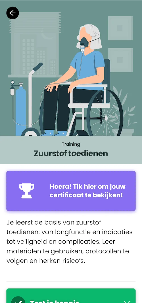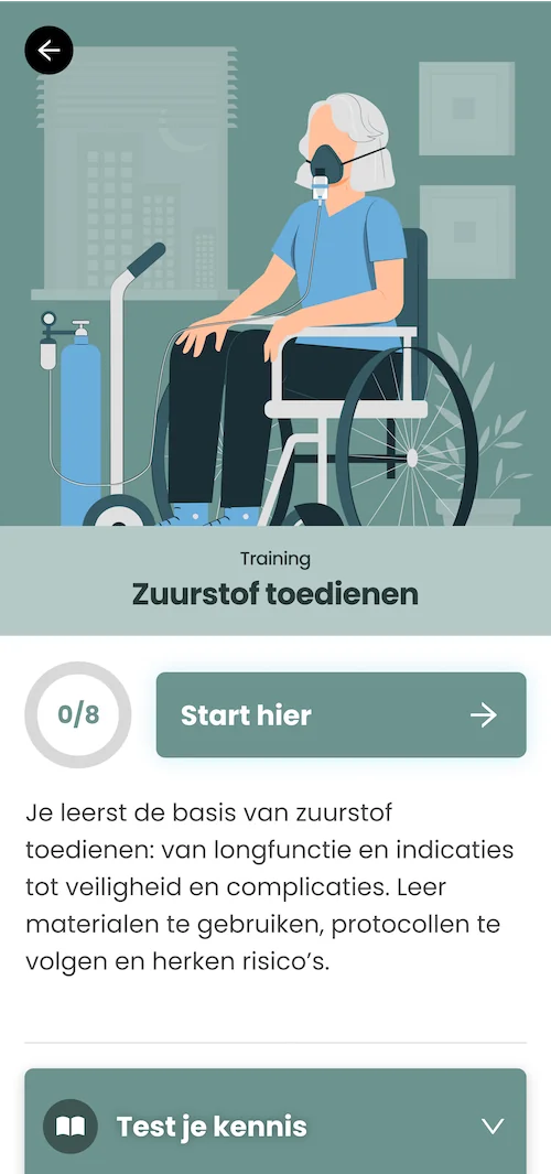 De training bestaat uit verschillende modules die aansluiten op de beroepspraktijk van Verzorgenden en Verpleegkundigen. Elke module bevat ook quizzen om de opgedane kennis te testen en te verankeren. De modules zijn opgebouwd rondom de belangrijkste aspecten van zuurstoftoediening, van de werking van de longen tot de praktische toepassing van protocollen.